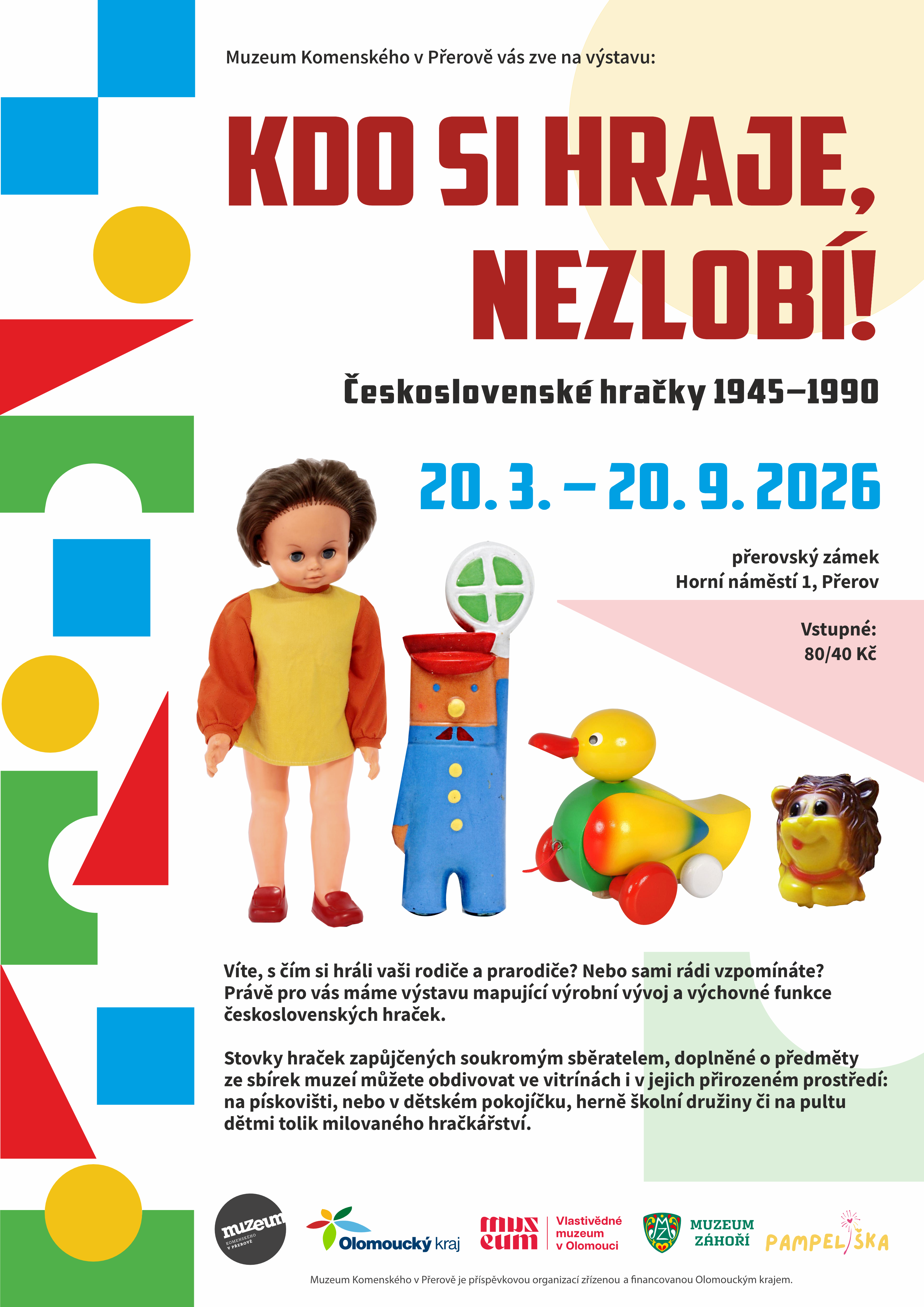 Do you know what your parents and grandparents played with? Or do you like to remember? The exhibition Who Plays, Doesn't Get Angry! will open with a vernissage on March 19, 2026 from 5:00 p.m. in the Ceremonial Castle Hall of the city of Přerov. It will be open to the public from March 20 to September 20, 2026 and will present a unique perspective on the development of Czechoslovak toys from the post-war period until 1990. Visitors can look forward to hundreds of exhibits loaned by a private collector as well as samples of collection items from the Comenius Museum in Přerov, the Museum of Local History in Olomouc, the Záhoří Museum and the Vinary Kindergarten.