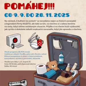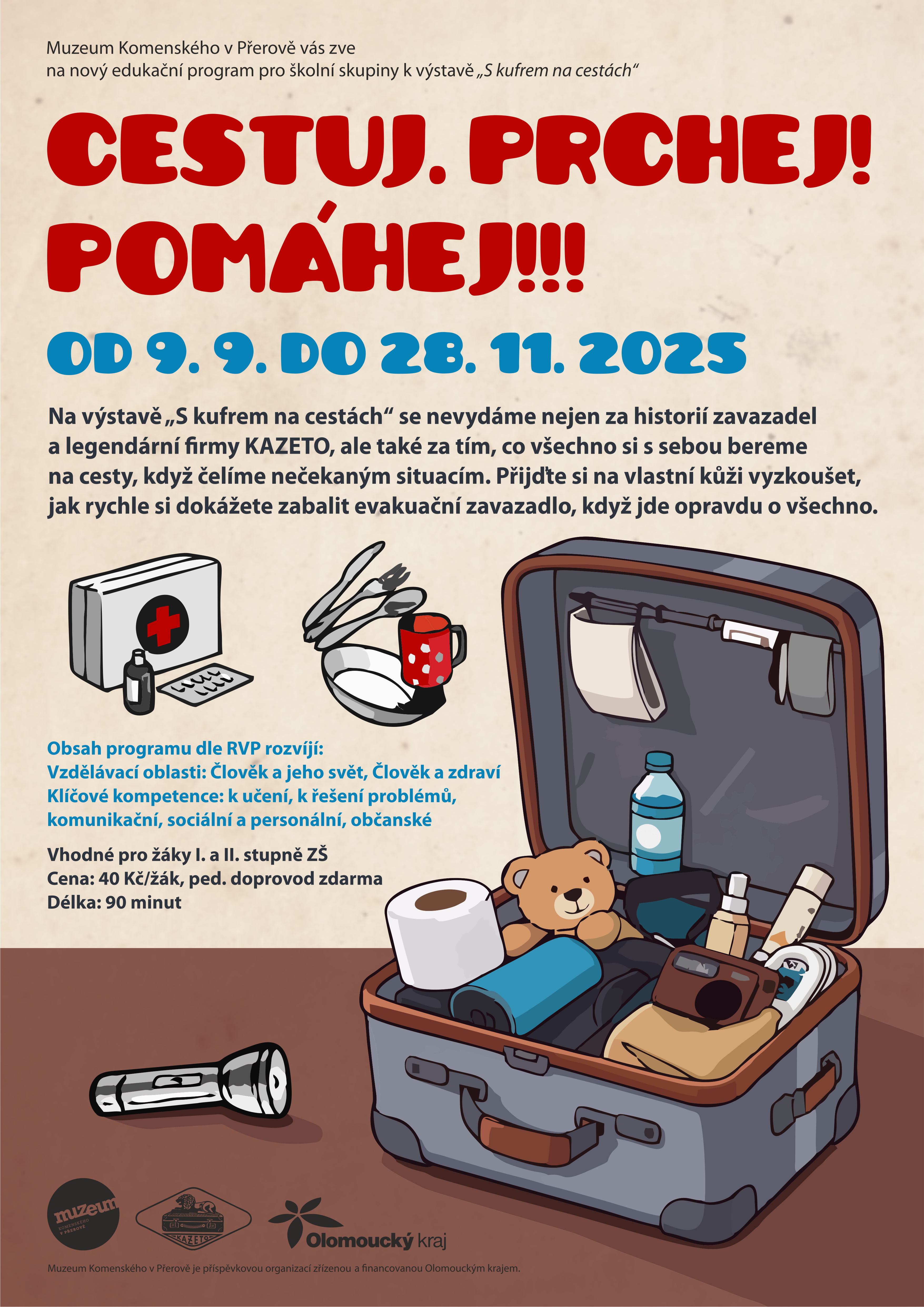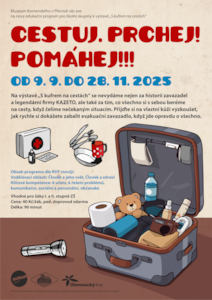 Na výstavě „S kufrem na cestách“ se vydáme nejen za historií zavazadel a legendární firmy KAZETO, ale také za tím, co všechno si s sebou bereme na cesty, když čelíme nečekaným situacím. K čemu slouží výstražné sirény a proč bychom měli vědět, co si zabalit do evakuačního zavazadla? Prozkoumáme základní výbavu lékárničky, zaposloucháme se do výstražných signálů a zkusíme si na vlastní kůži, co všechno se vejde do jednoho „kufru“ a jak rychle se dokážeme sbalit na cestu, když jde opravdu o všechno.