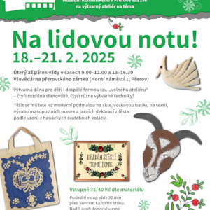 Ve dnech 18.–21. 2. 2025 (tj. úterý až pátek) jsme pro vás v prostoru muzejní Vševědárny (přerovský zámek, Horní náměstí 1) opět připravili kreativní program formou tzv. "volného ateliéru" – čtyři rozdílná stanoviště, čtyři různé výtvarné techniky! V letošním roce budeme tvořit na lidovou notu – nechte se inspirovat tradicemi a folklórními motivy nejen z Hanáckých krojů.