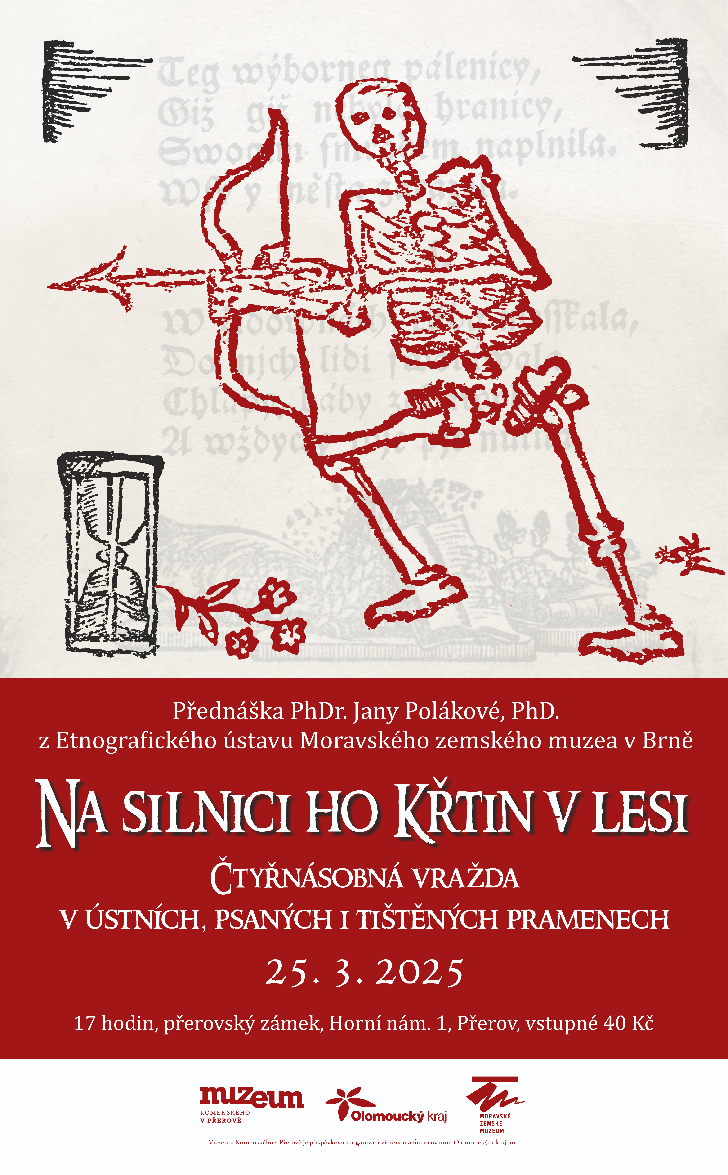 V úterý 25. března 2025 vystoupí na přerovském zámku jedna z autorek výstavy PhDr. Jana Poláková, Ph.D., etnografka Moravského zemského muzea v Brně. Přednáška představí tragické události z 5. července 1907 – čtyřnásobné vraždě nedaleko dnešního městyse Křtiny, a její reflexi v oficiálních tištěných a písemných pramenech a regionální ústní tradici.