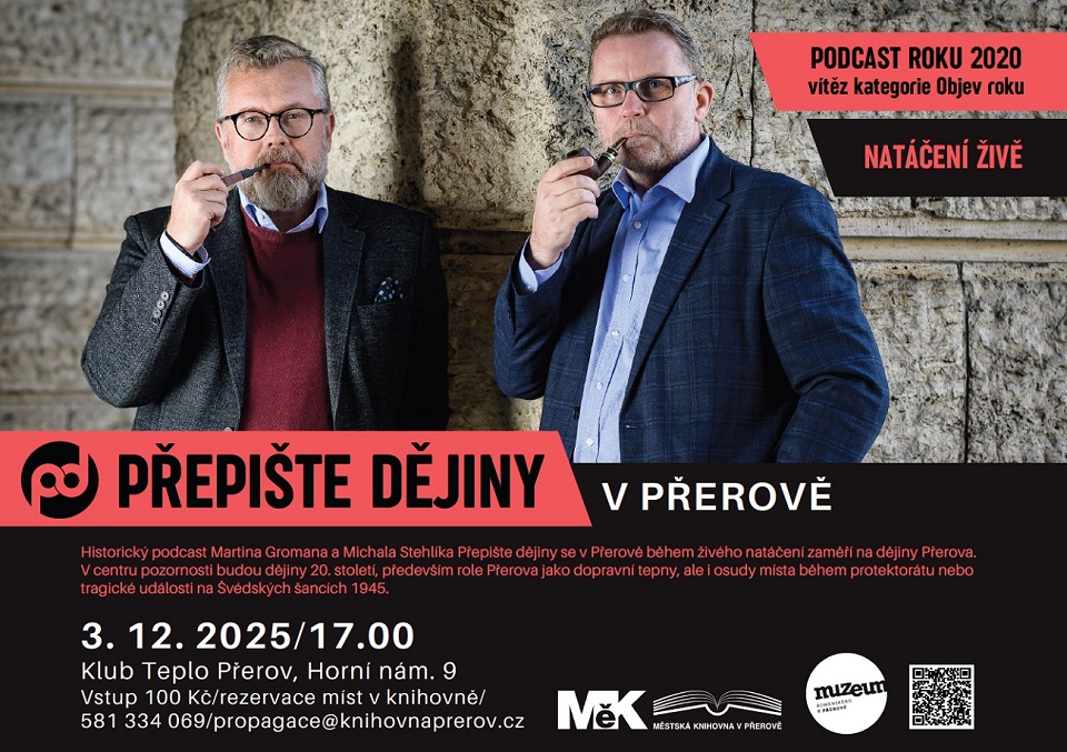 Populární historický podcast Přepište dějiny, který se stal v roce 2020 vítězem v kategorii Objev roku, zamíří v prosinci konečně také do Přerova! Městská knihovna v Přerově a Muzeum Komenského v Přerově vás zvou na jeho živé natáčení!