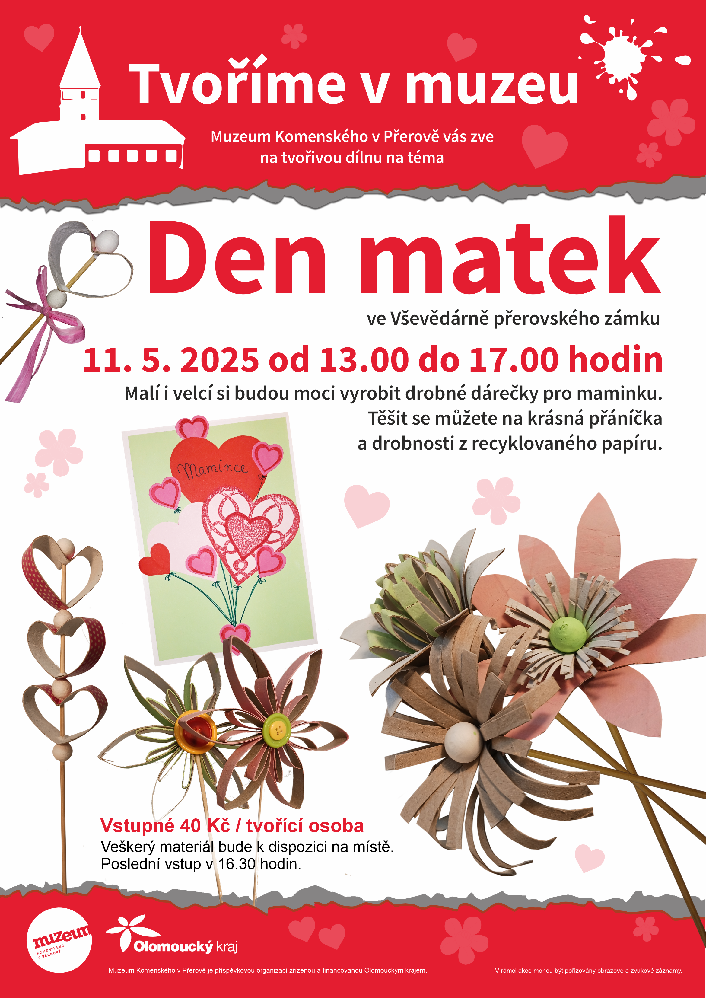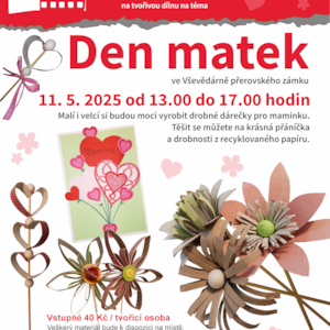 Tentokrát se bude konat v neděli 11. května od 13.00 do 17.00 a společně vytvoříme něco pro maminky. Dárkovou taštičku, květiny, které vydrží déle než týden, nebo milé přáníčko.