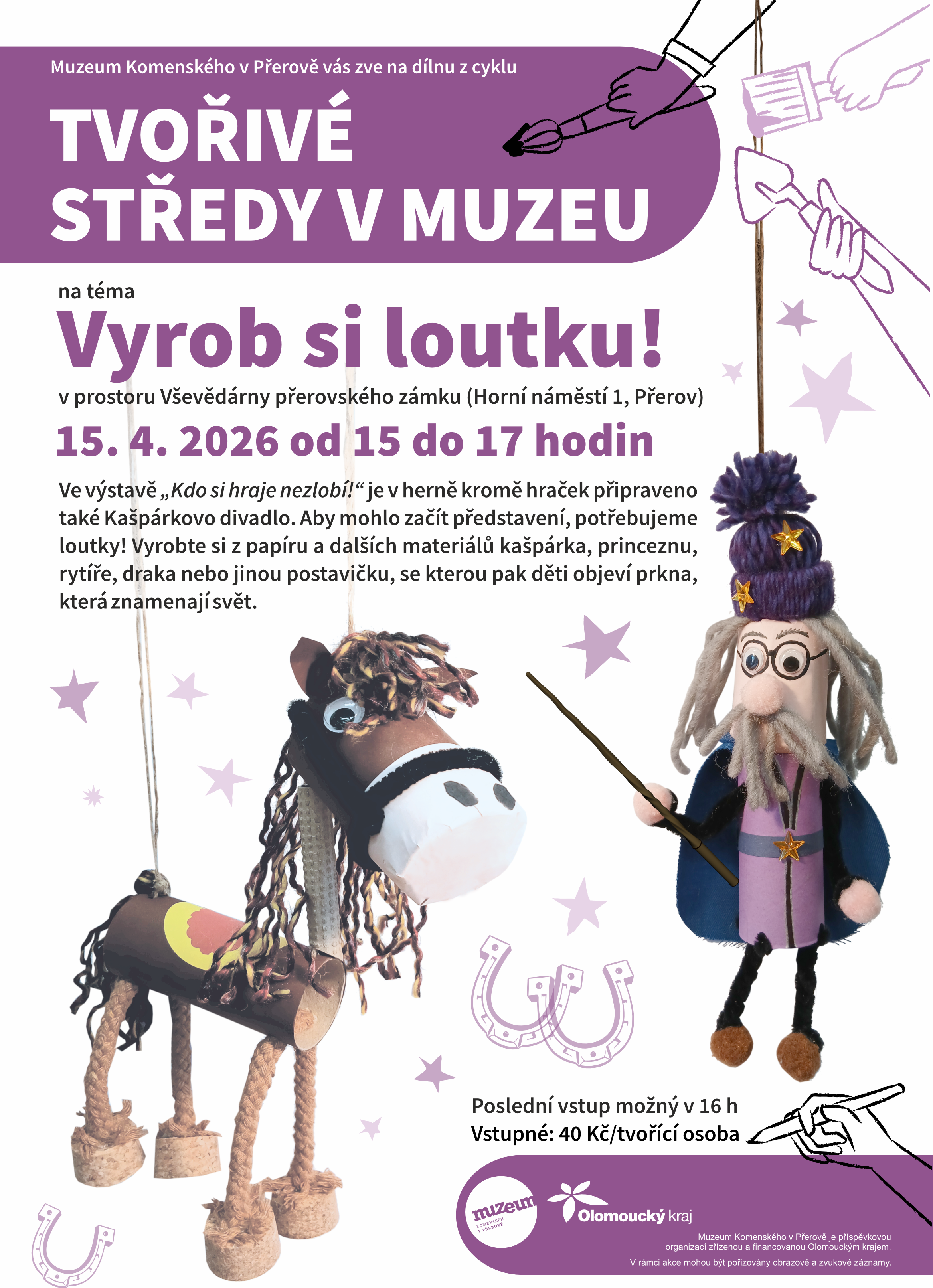 Ve výstavě „Kdo si hraje nezlobí!“ je v herně kromě spousty hraček připraveno také dětské divadélko. Aby však mohlo začít představení, potřebujeme loutky! Přijďte si vyrobit z papíru a dalších materiálů kašpárka, rytíře, draka nebo jinou postavičku, se kterou pak děti objeví prkna, která znamenají svět. Vševědárna přerovského zámku, od 15.00 do 17.00 hodin.