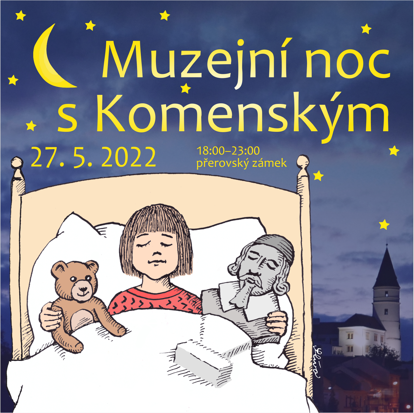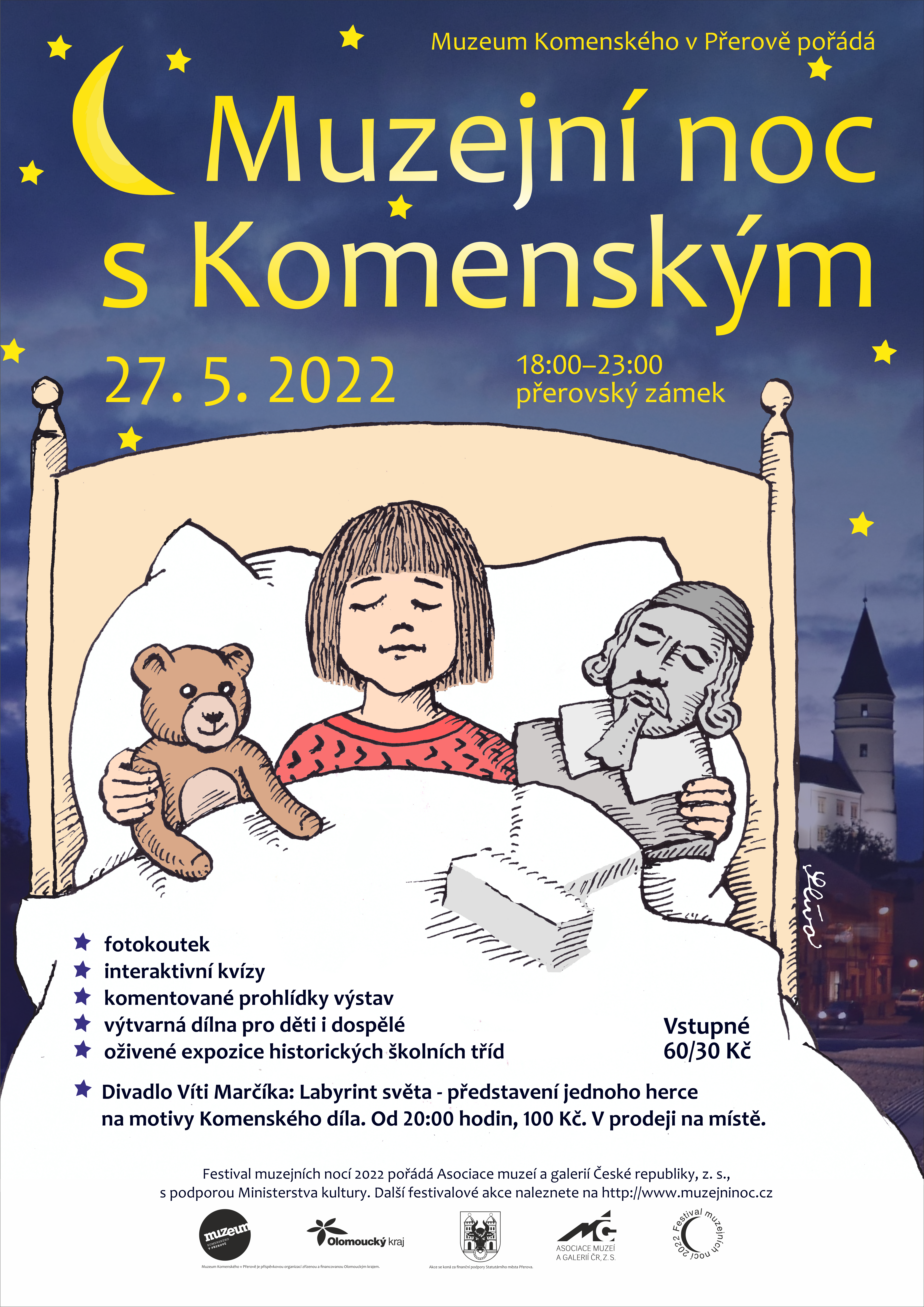 proběhne v pátek 27. května 2022 od 18.00 do 23.00 hodin v prostorách přerovského zámku. Vydejte se s námi do 17. století - připravili jsme pro vás komentované prohlídky aktuálních výstav, ale i scénkami oživené vybrané stálé expozice. A kdo ví, třeba potkáte i samotného Komenského!
