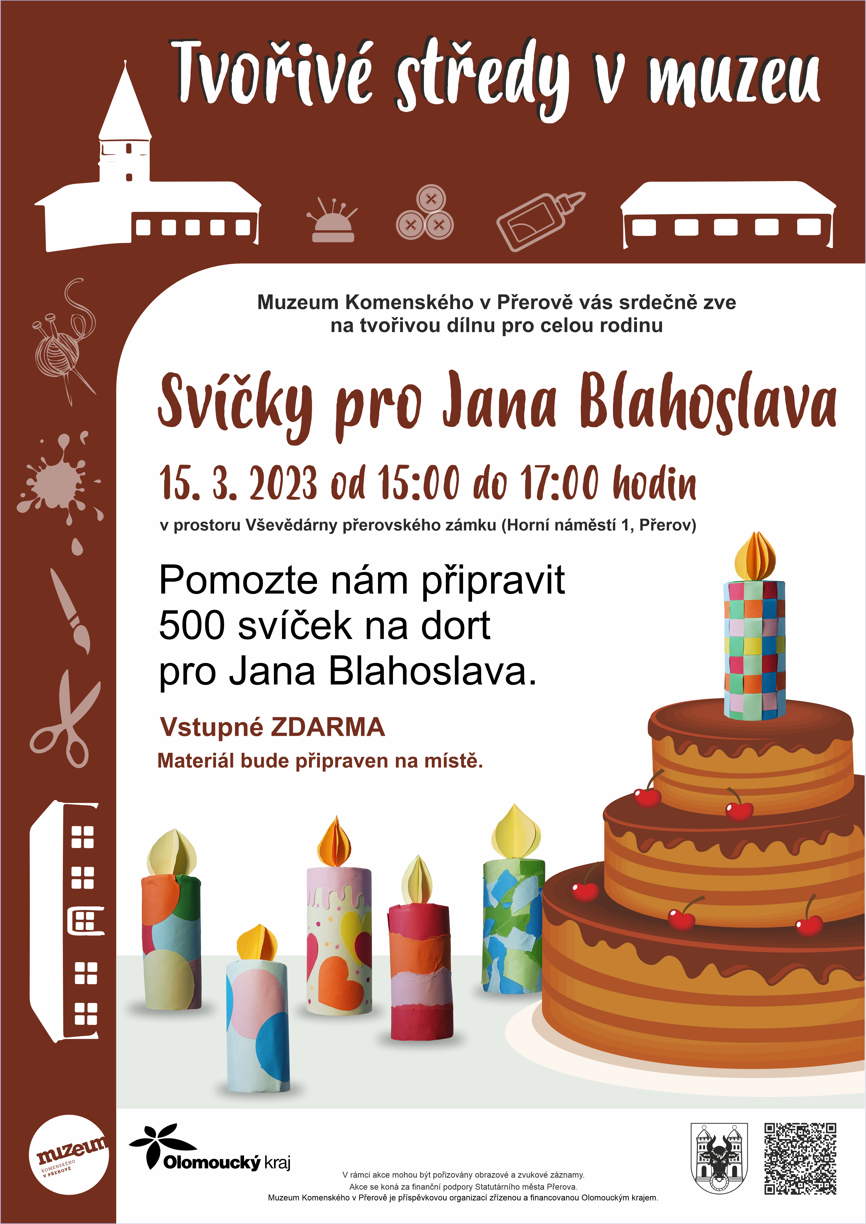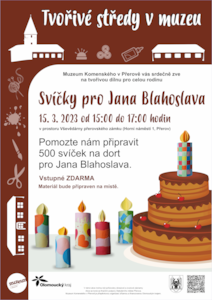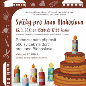 V únoru uplynulo přesně 500 let od jeho narození. V květnu pak uběhne 100 let od odhalení pomníku na Horním náměstí, který vytvořil grafik, sochař a architekt František Bílek.. A právě 20. května 2023 chceme Janu Blahoslavovi připravit velikánský narozeninový dort. Ale potřebujeme 500 dortových svíček! Přijďte nám pomoci je připravit!